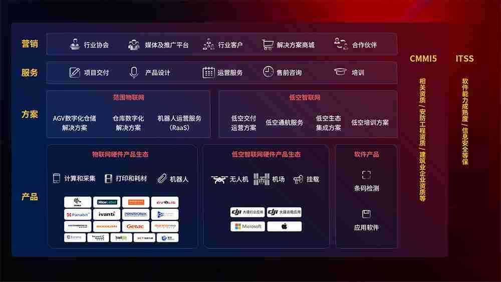 聚合国内外先进的物联网硬件产品品牌,,,聚焦数字化仓储、、机器人运营、、、低空智联网等领域,,,共同打造适合客户业务场景的解决方案并提供交付服务