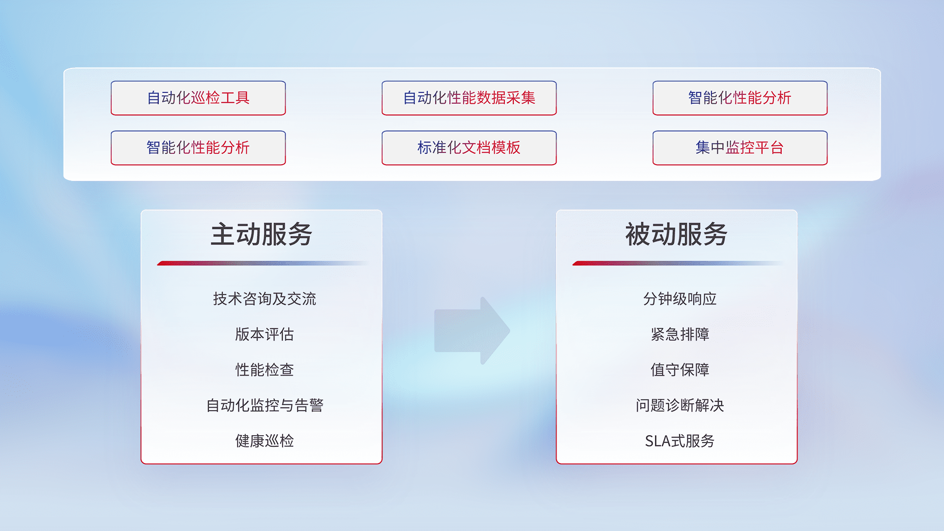 智能化工具和标准化文档,,,,保障服务质量,,,提供主动服务(包含技术咨询、、、版本评估、、、、性能检查、、、、自动化监控与告警、、健康巡检)和被动服务包含(分钟级响应、、、、紧急排障、、、、值守保障、、问题诊断解决、、SLA服务)。。。。