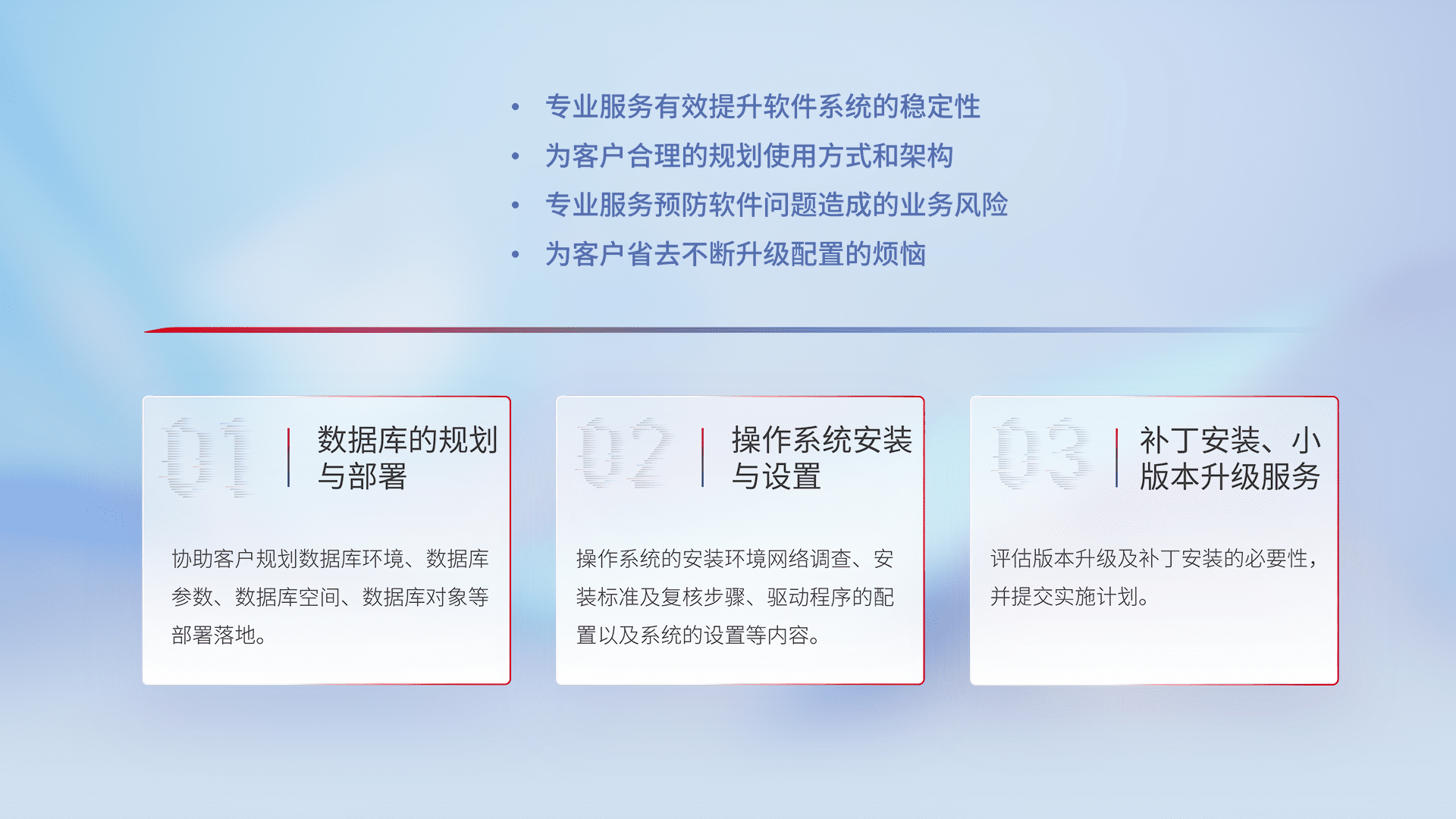 为客户提供软件规模升级、、、快速部署、、按需配置的专业服务,,从数据库的规划与部署到操作系统的安装与设置,,,,再到补丁安装和小版本升级提供支持。。